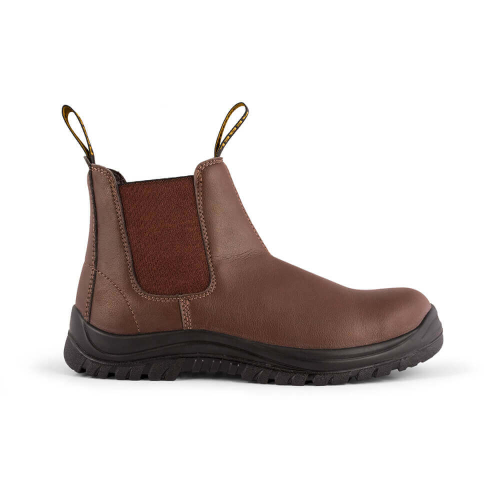 An easy slip-on brown chelsea boot with a steel midsole for anti-penetration and a smooth micro-fibre upper offering excellent durability and breathability.