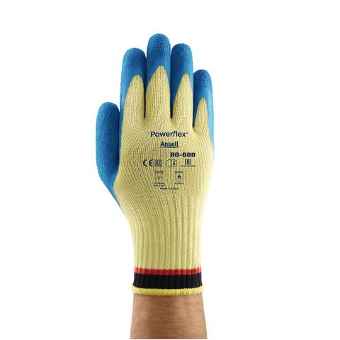 • The Ansell PowerFlex 80-600 glove is rated at the exceptionally high cut level of EN level 4. This high level of protection is achieved through the Kevlar® knitted liner and natural rubber coating. This coating stands up very well to abrasion, tearing and punctures.